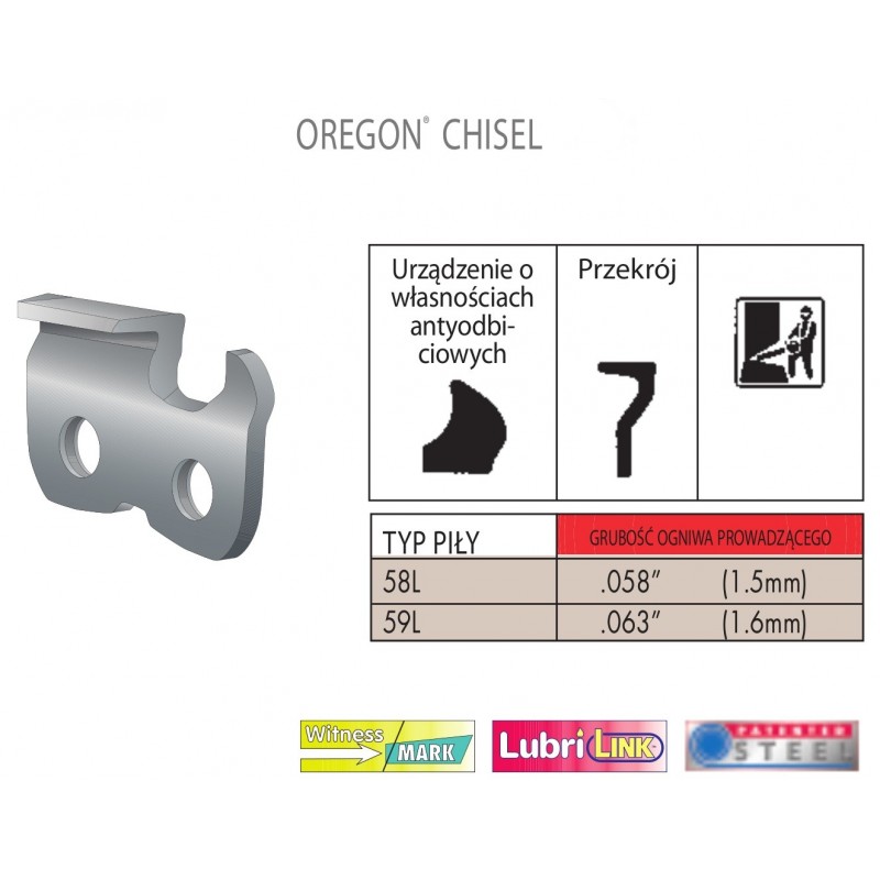 Mocny łańcuch z ogniwami prowadzącymi redukującymi odbicie, przeznaczony do dużych pilarek obsługiwanych przez profesjonalnych użytkowników.